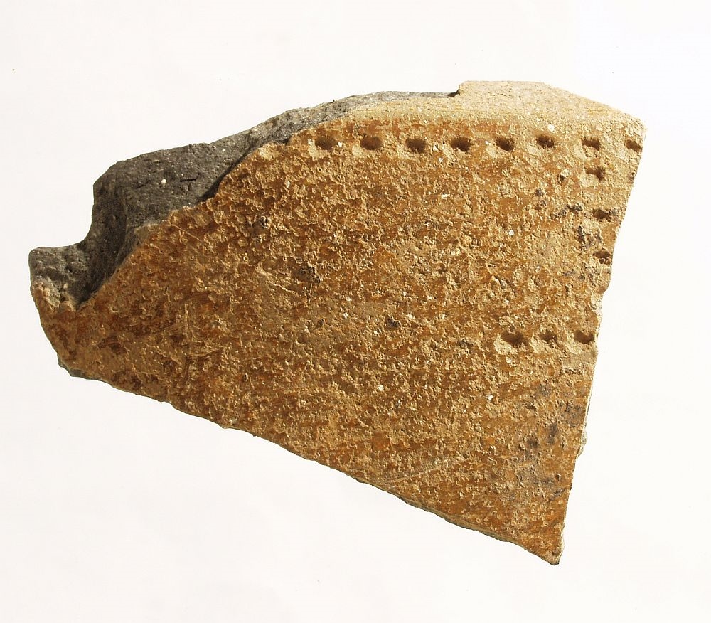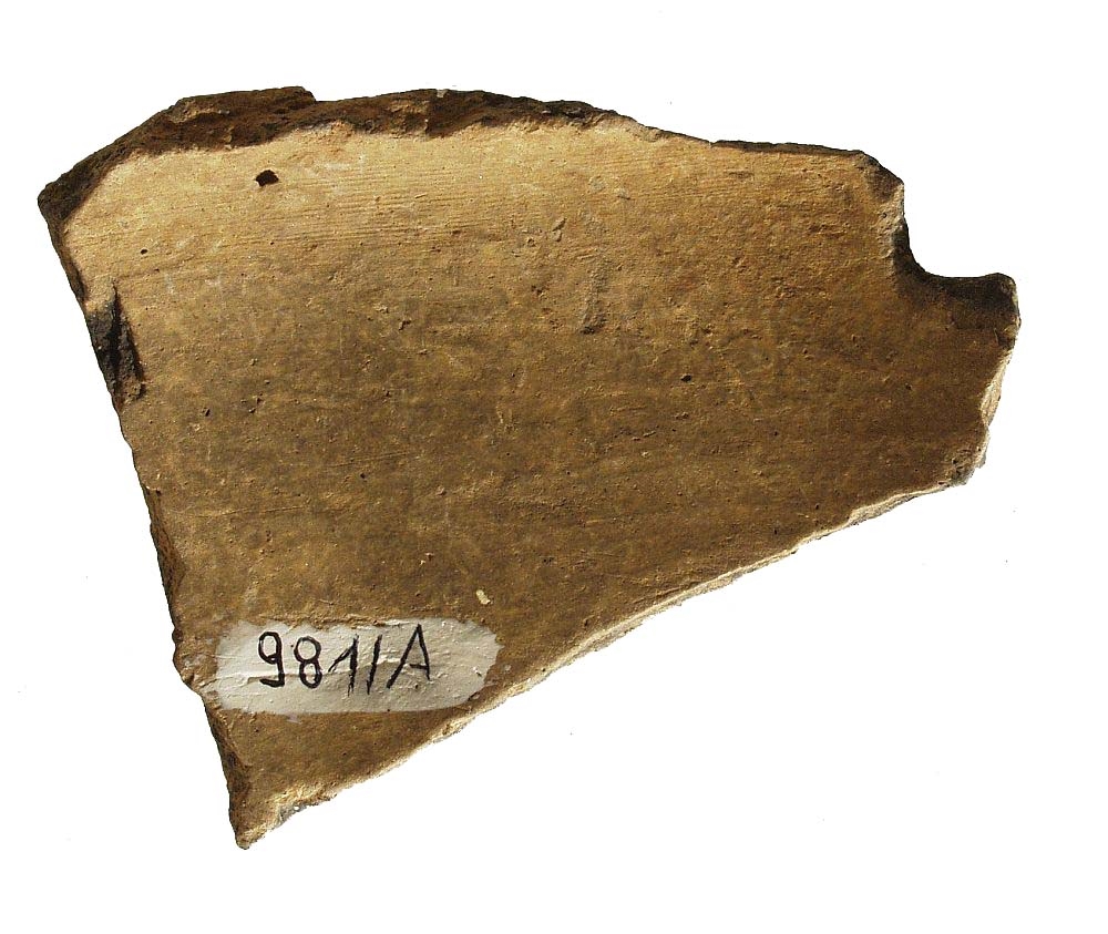Ulomak oštro rezanog ramena ispod kojeg se spušta koničnitrbuh posude. Rame je ukrašeno vodoravnim nizom okruglih uboda ispod kojeg se spušta motov obrnutog slova L izvedenog na isti način.