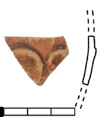 Ulomak trbuha šalice s barbotin ukrasom. Keramika je crvene boje od fino pročišćene gline.