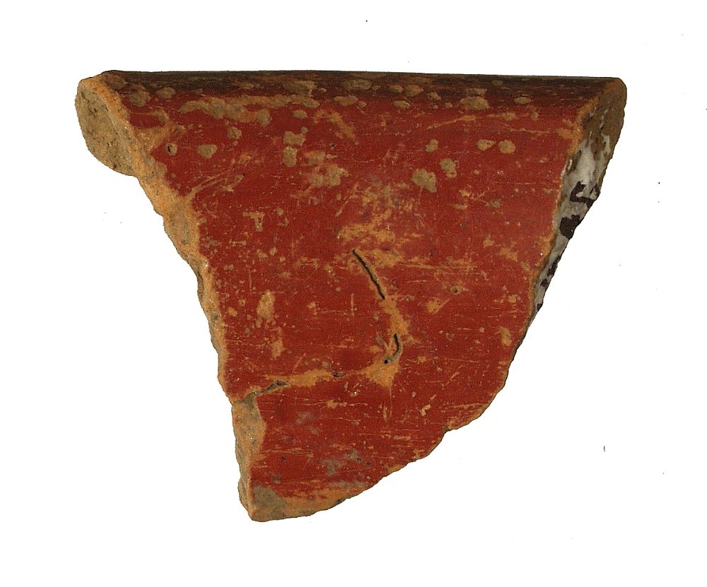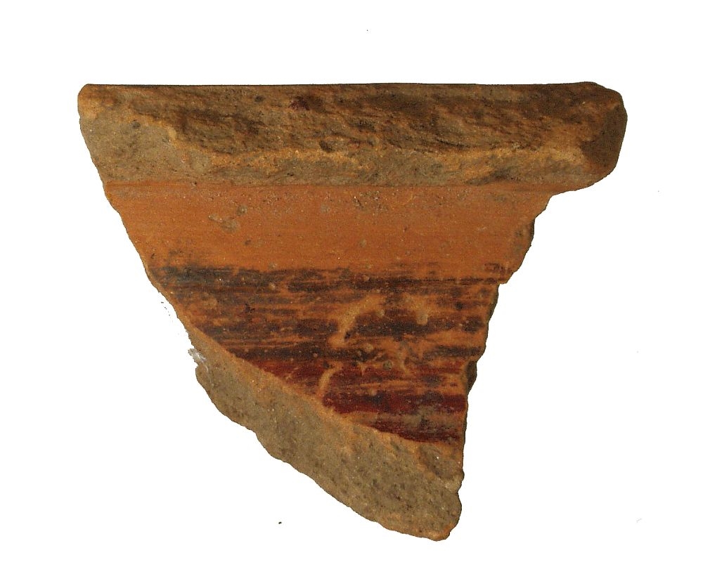 Ulomak blago prema vani izbačenog ušća posude ispod kojeg se nalazi kratki konusni vrat. Keramika je fina,s vanjske strane ukrašena grafitiranjem, dok je unutrašnja strana ukrašena brvenim okerom.