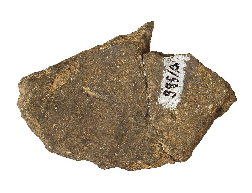 Ulomak posude ukrašen mrežasto šrafiranim trakama koje su ispunjene bijelom inkrustacijom.