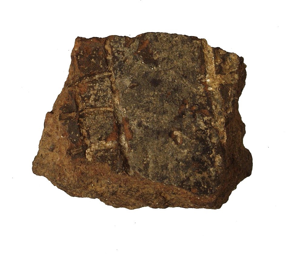 Ulomak posude ukrašen mrežasto šrafiranim trakama koje su ispunjene bijelom inkrustacijom.
