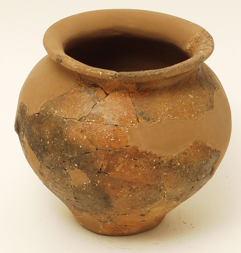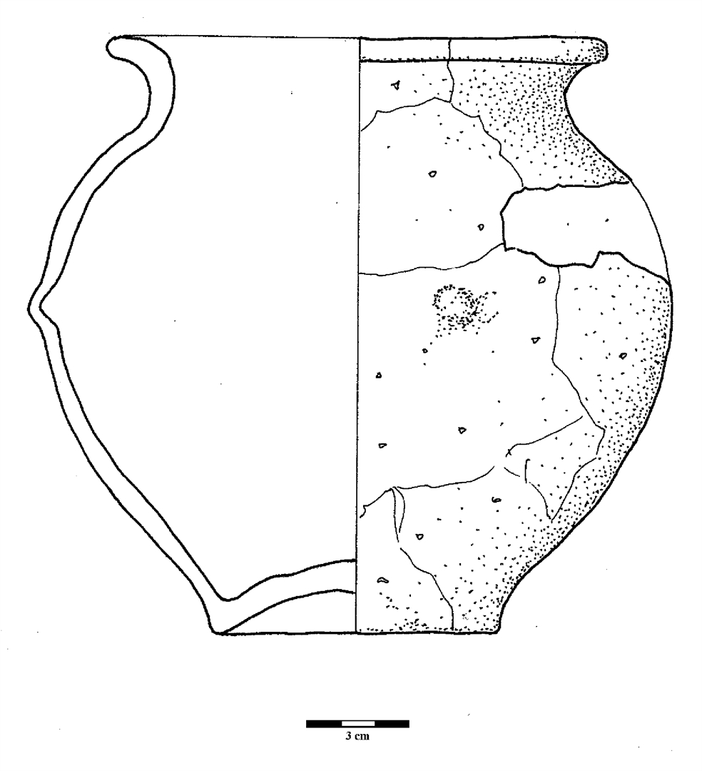 Žara ušća izbačenog prema vani ispod kojeg se nalazi kratki suženi vrat na koji se nadovezuje zaobljeni trbuh koji završava uskim i konkavnim dnom. Keramika je gruba i sa dosta primjesa kalcita, a boja joj varira od tamnosmeđe do sive. Trbuh posude bio je ukrašen sa tri plastične bradavice.