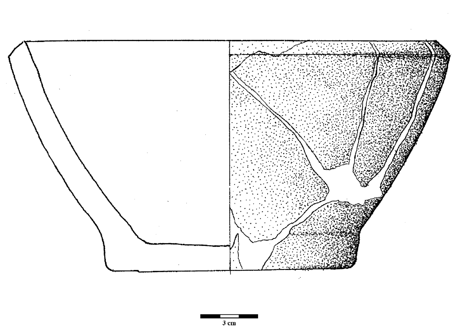 Žara nenaglašenog i prema unutra zakošenog ušća ispod kojeg se spušta konusni trbuh na čijem se kraju nalazi ravno dno. Keramika je crvenkastosmeđe boje sa puno primjesa kalcita.