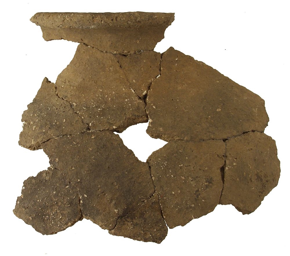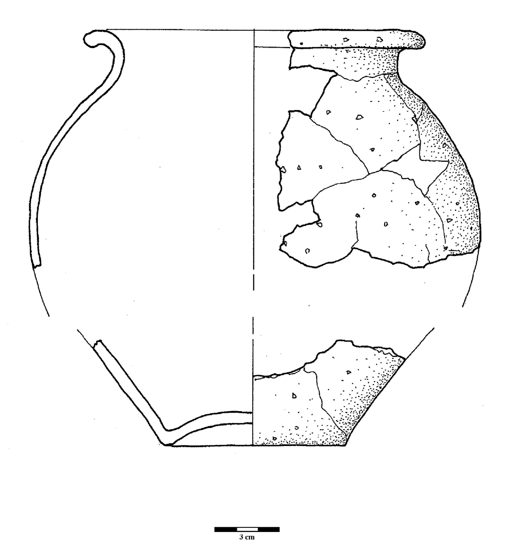 Ulomaci trbušaste posude sa suženim vratom i prema vani izvijenim ušćem. Keramika je sivo smeđe boje sa dosta primjesa kalcita.