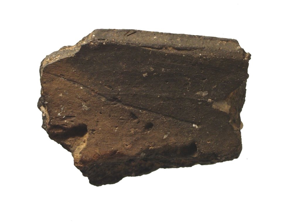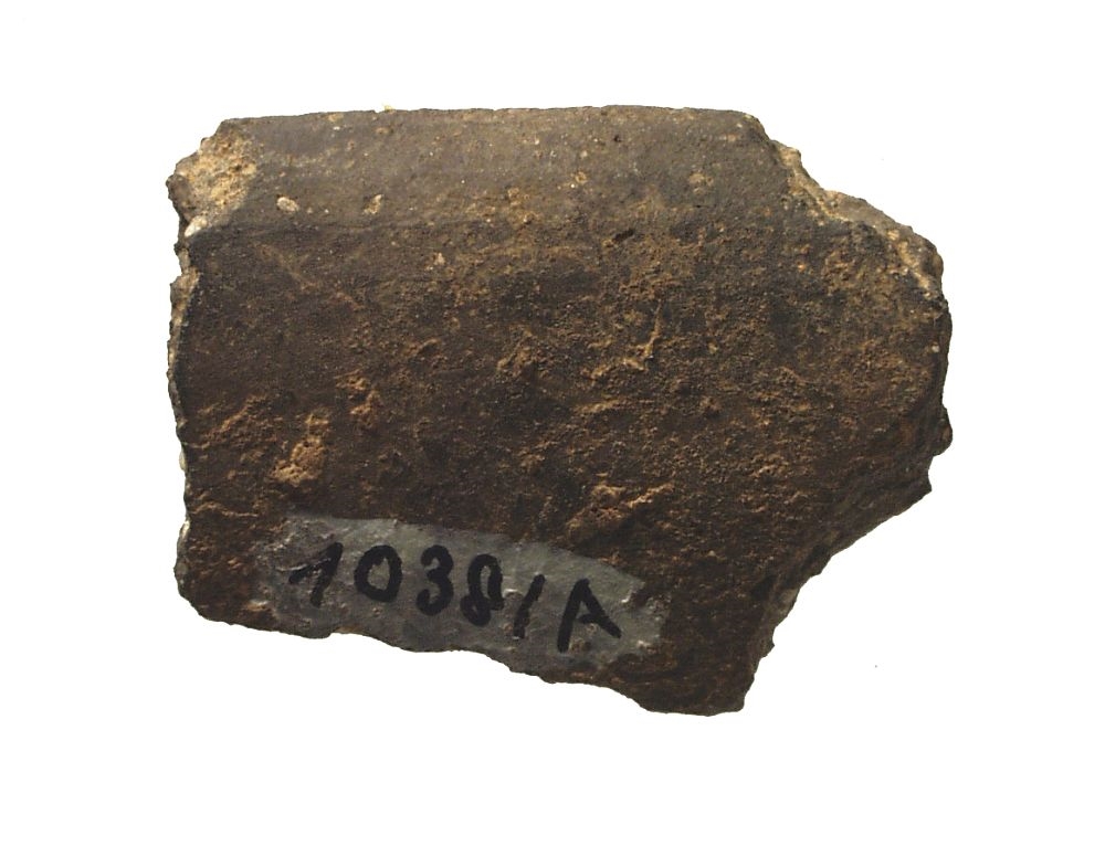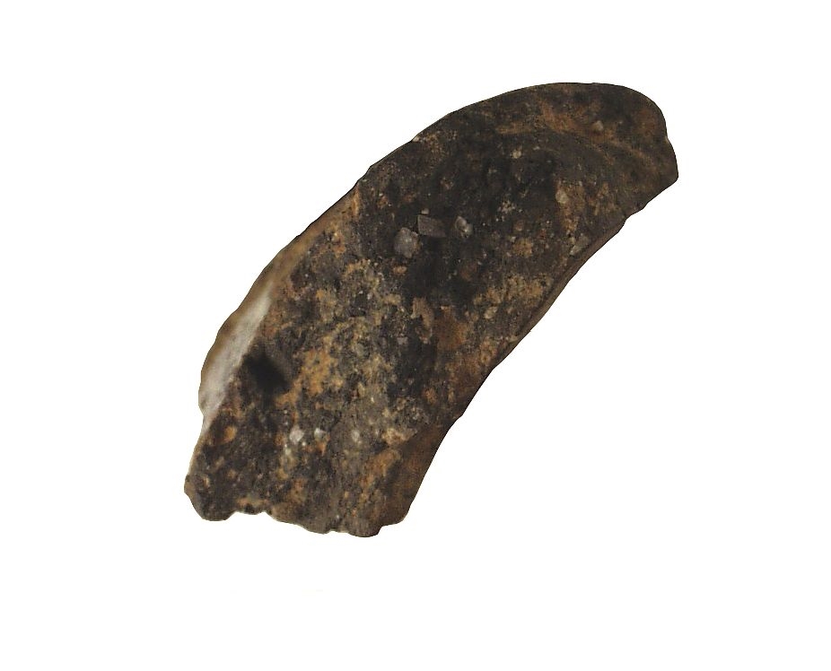 Ulomak prema vani izbačenog ušća posude. Keramika je smeđesive boje sa dosta primjesa kalcita.