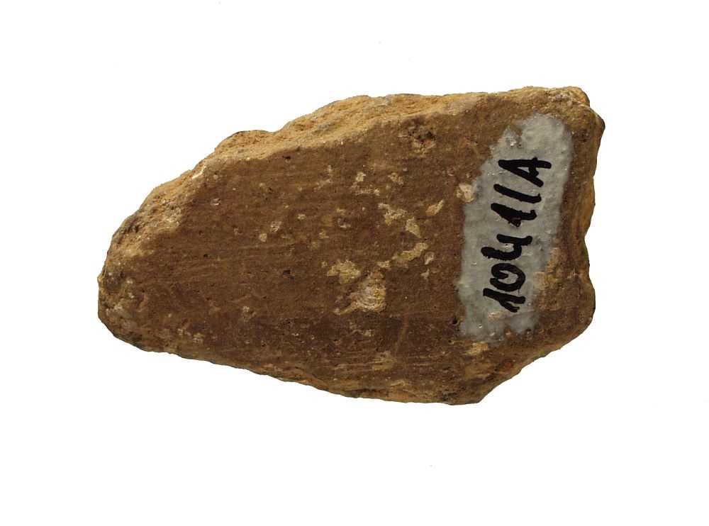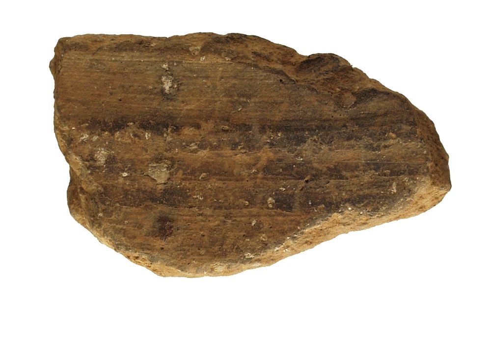 Ulomak posude ukrašene dvjema plitkim horizontalnim kanelurama. Keramika je sivosmeđe boje sa primjesama kalcita.