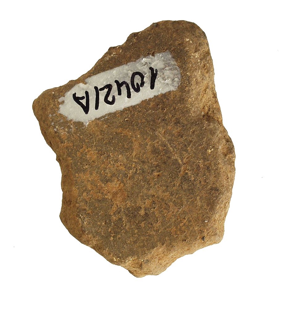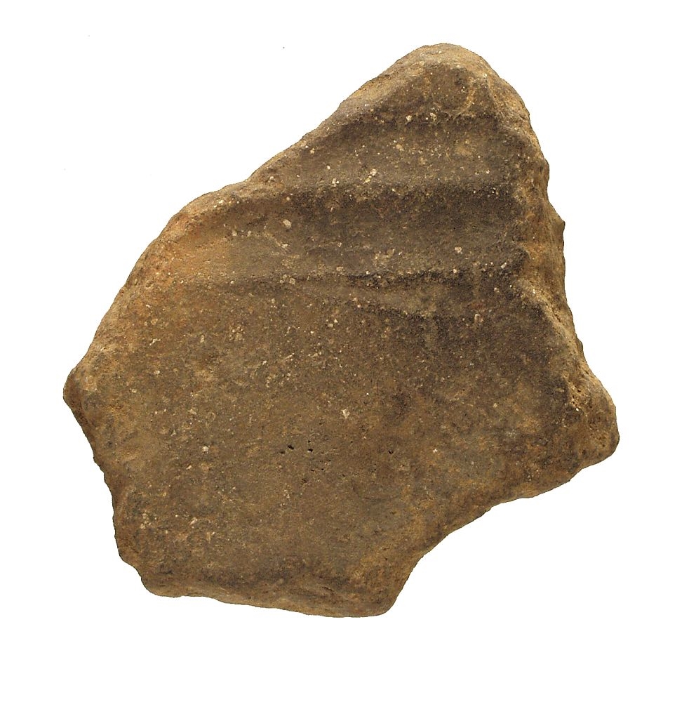 Ulomak posude ukrašene sa dvije horizontalne kanelure. Keramika je sivosmeđe boje sa dosta primjesa kalcita.
