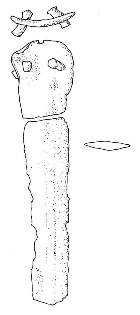 Dva djela brončanog bodeža s ravnom oštricom, nedostaje vrh, te zaobljenom drškom sa tri zakovice od kojih su dvije sačuvane.