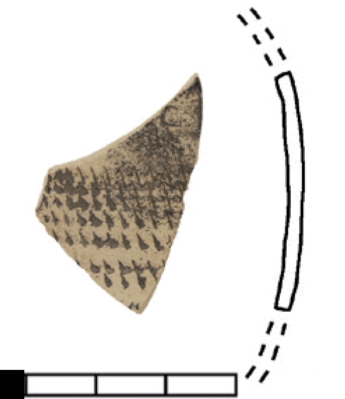 Ulomak tijela posude. Keramika je sive boje s lustrom od fino pročišćene gline. posuda je ukrašena s šest redova kosih crta izvedenim kotačićem.