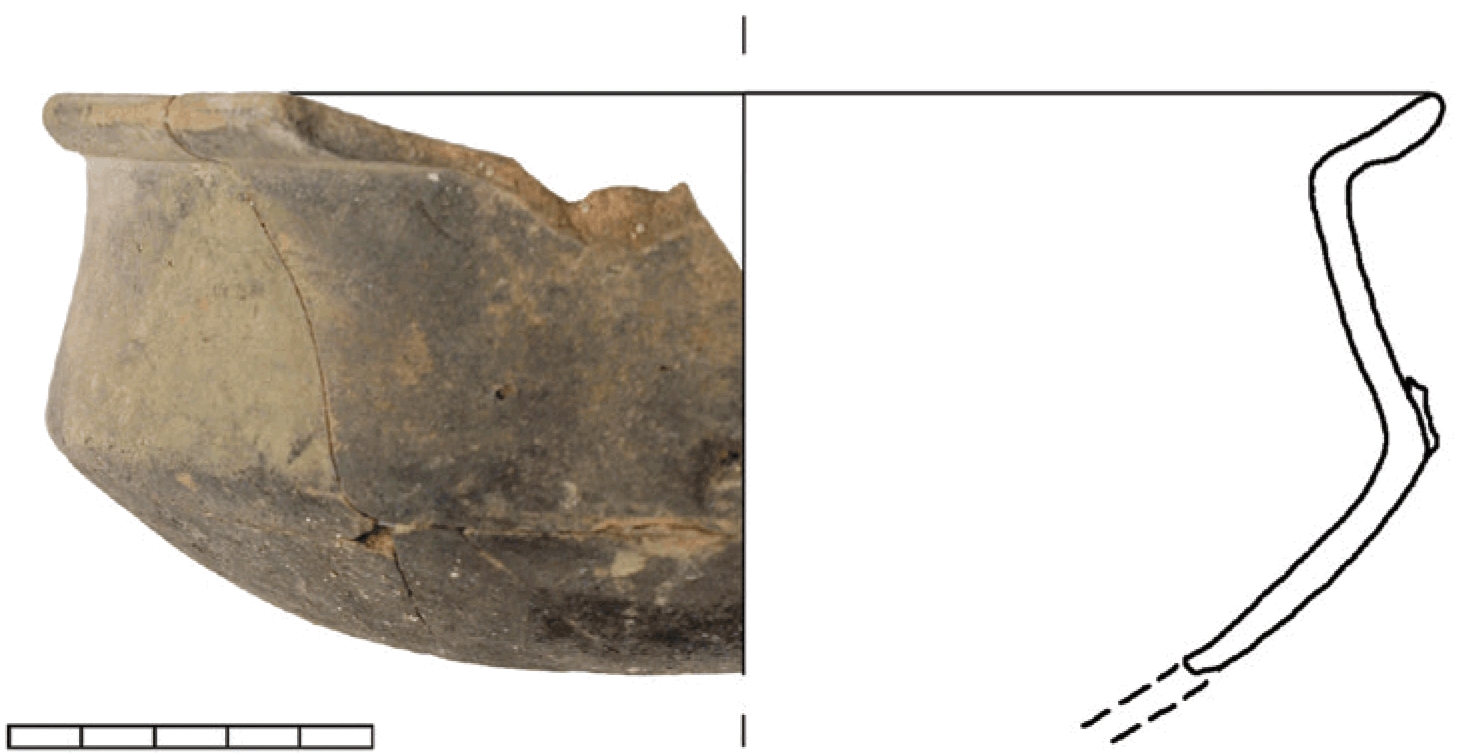 Fragmentirani lonac. Smeđa glina s primjesama kvarca i sitnog pijeska. Izvana sloj gareži.