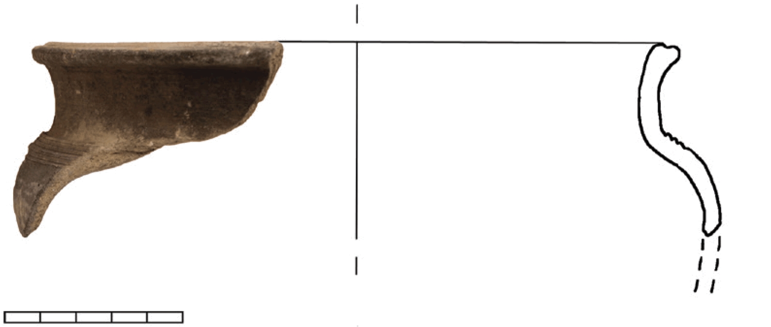 Ulomak oboda i ramena lonca. Tamno siva glina, primjese sitnog pijeska, bijelih kamenčića, kvarca. Izvana tragovi gareži.