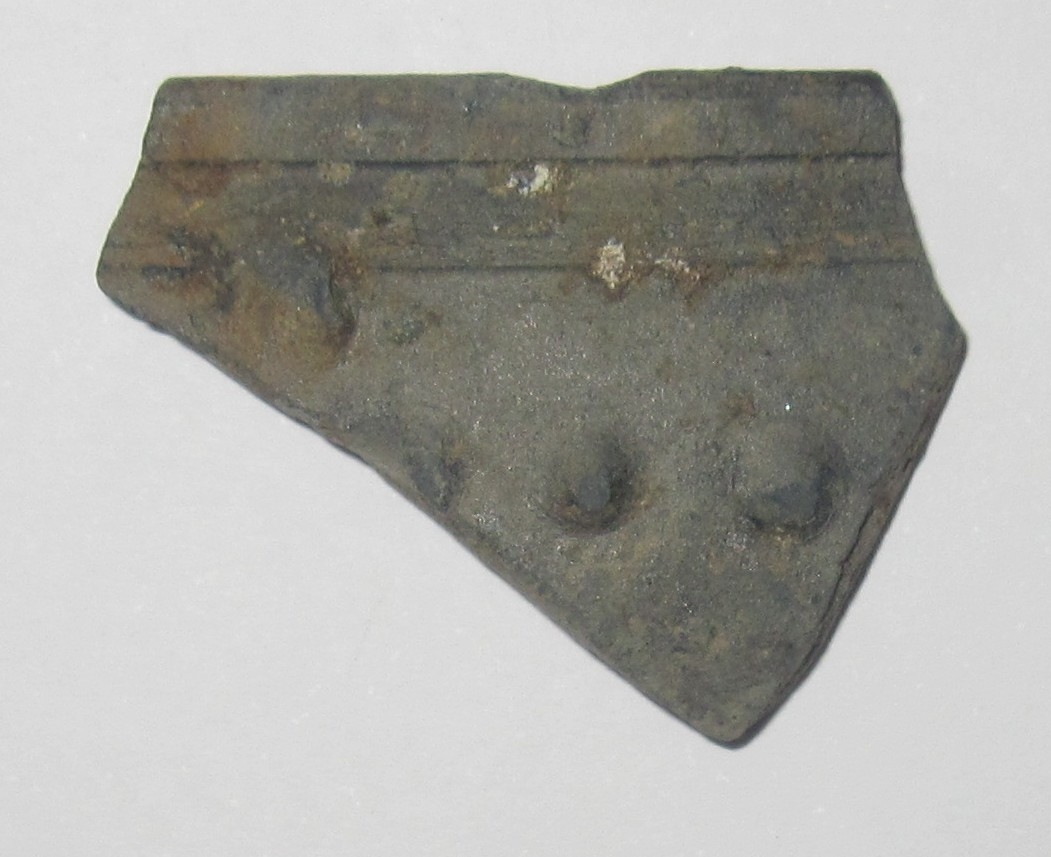 Ulomak okomitog oboda. Keramika je sive boje s lustrom od fino pročišćene gline. Ukras je izveden barbotin točkama i kružno urezanom trakom.