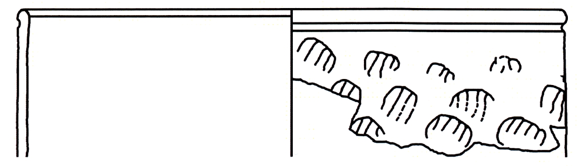 Ulomak oboda bikoničnog pehara izrađenog od sive keramike s lustrom od fino pročišćene gline. Ukras ljuske češera.