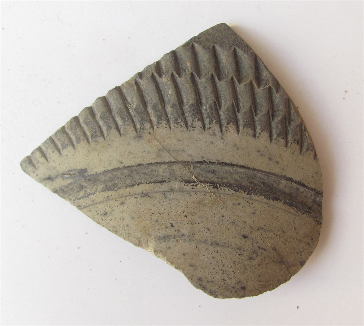 Ulomak tijela posude. Keramika je sive boje s lustrom od fino pročišćene gline. Ukrašena je sa tri reda kosih crta izvedenih kotačićem.
