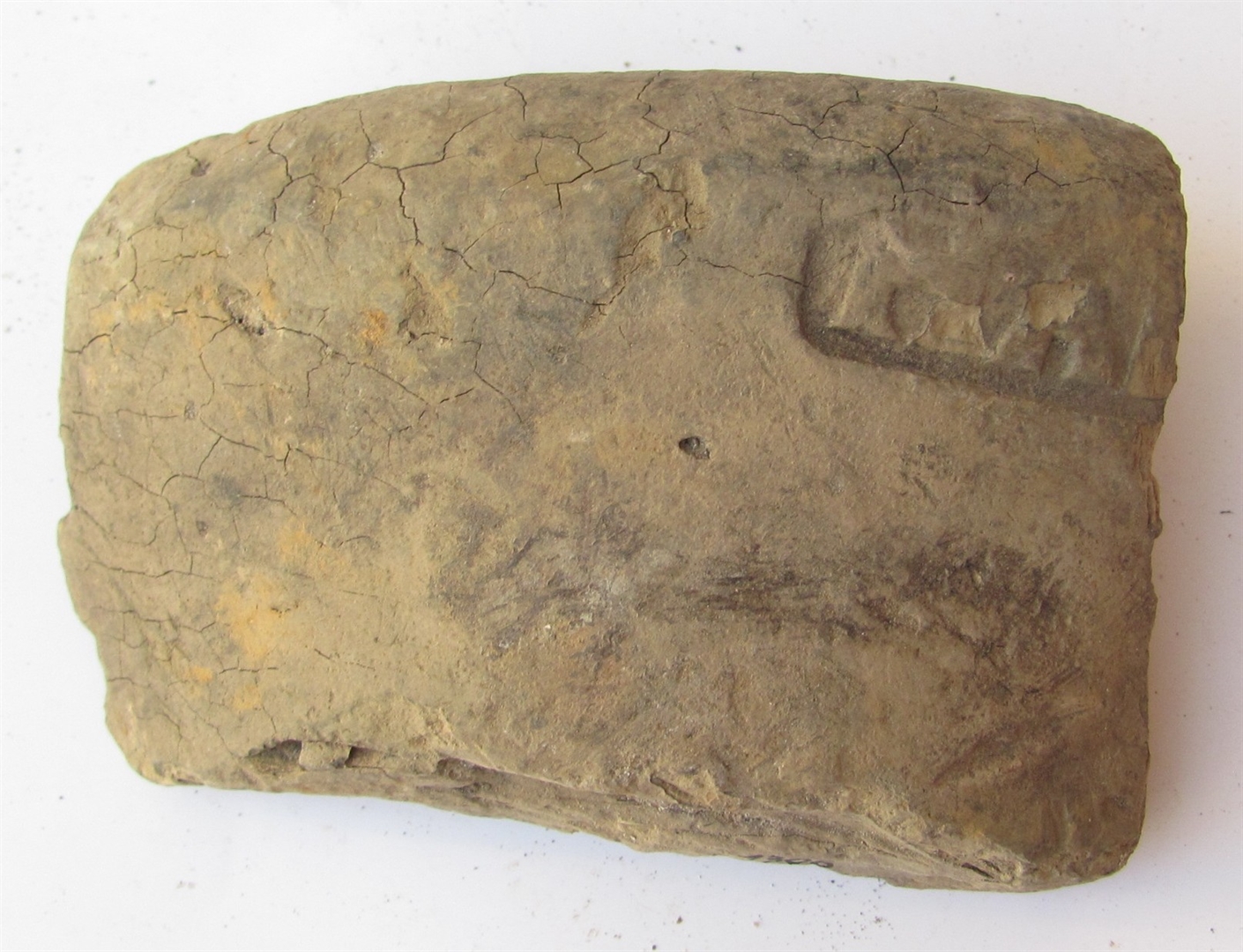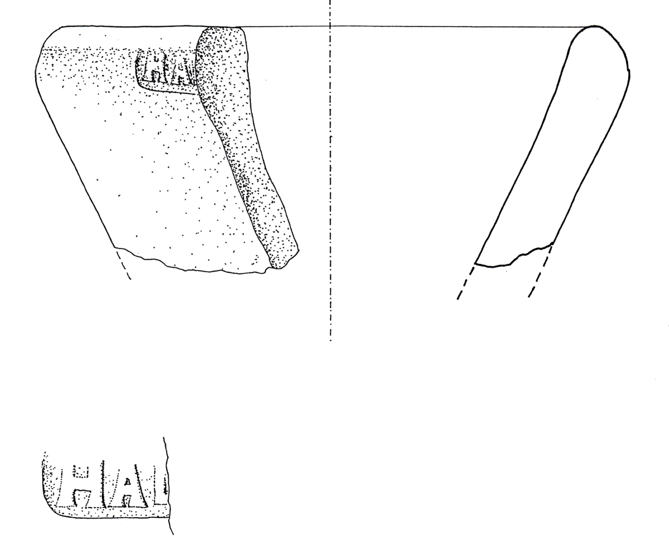 Ulomak oboda s djelomično sačuvanim pečatom HAD [AVG]. Keramika sive boje, od loše pečene gline.
