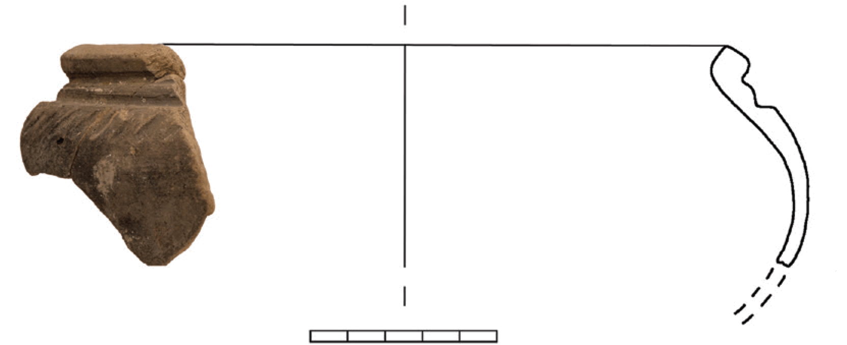 Ulomak lonca s višestruko profiliranim obodom i vertikalnim urezima na ramenu. Svijetlo smeđa/narančasta keramika, dosta primjese vrlo sitnog kvarca i kamenčića, liskun. Izvana tragovi gareži.