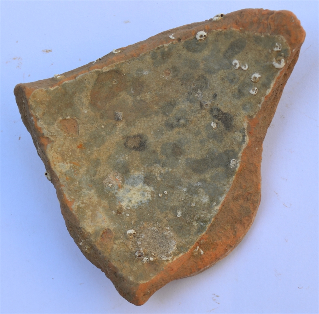 Ulomak dna zdjelice s prstenastom nogom. Crvena, dobro pročišćena glina, engoba i prozirna glazura s unutrašnje i vanjske strane. Na svijetloj podlozi je ukras plavih mrlja. Engobirana slikana keramika.