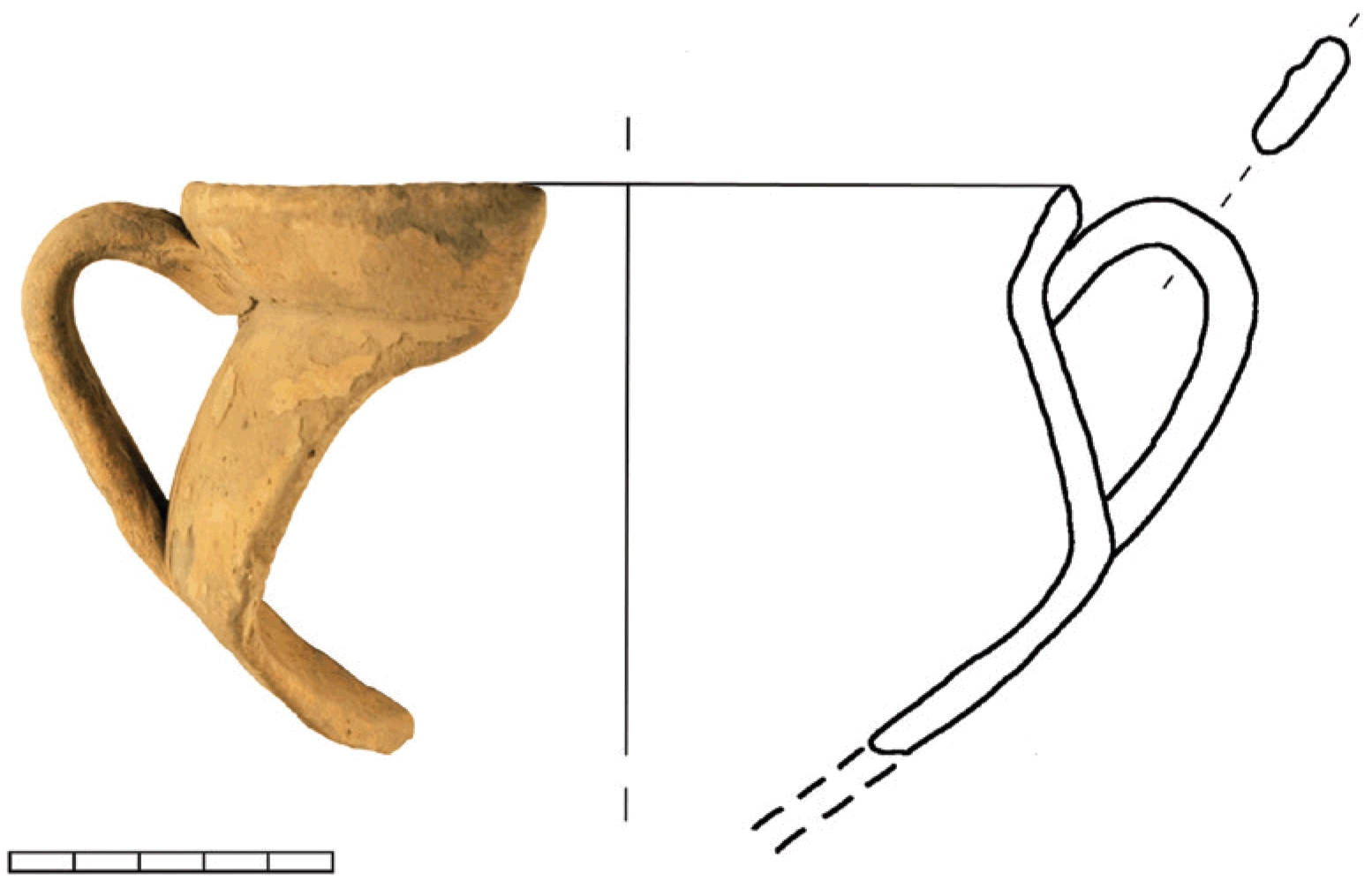 Fragmentirani lonac s ručkom. Oker boja, loša kvaliteta glina s primjesama sitnog pijeska.