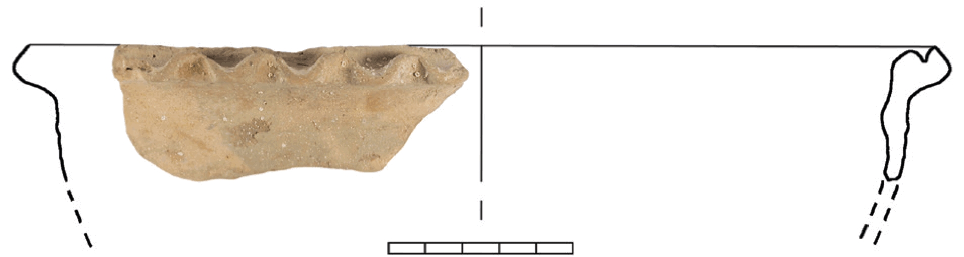 Fragment kupe s valovito izvedenim obodom. Svijetlo smeđa/oker glina, primjese sitnih bijelih kamenčića vidljivih i na površini.
