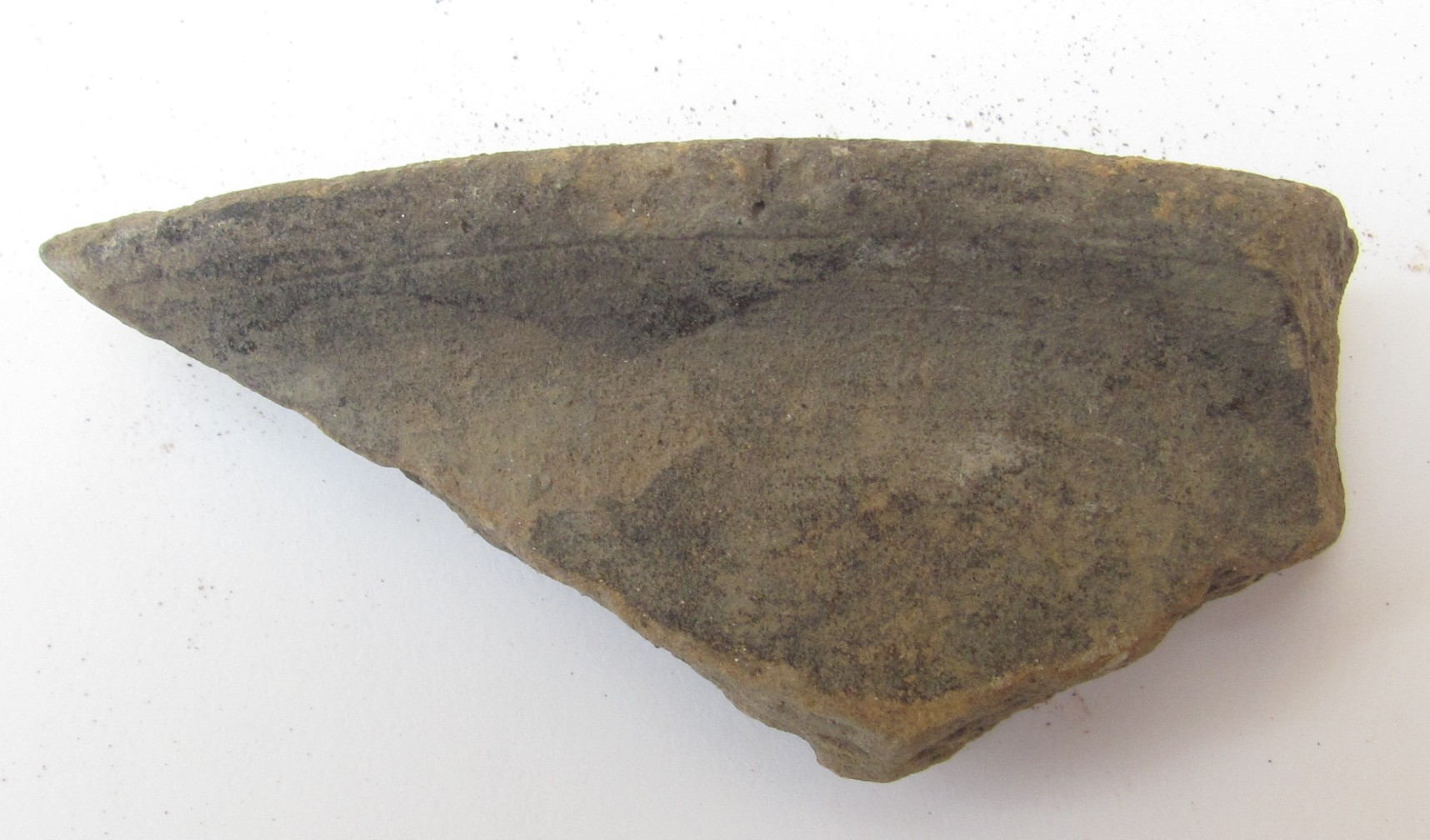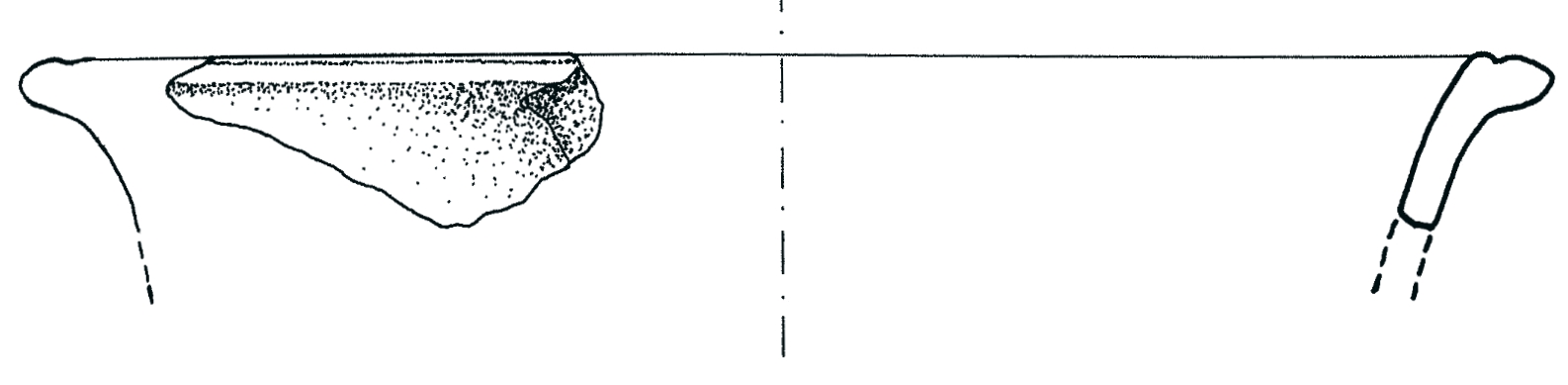 Ulomak gornjeg dijela zdjele s izvijenim obodom koji na unutrašnjoj strani profiliran s manjim hrbatom i tri koncentrična kruga koji stepenasto padaju prema unutrašnjosti posude. Glina je narančaste do sive boje s malo svjetlucavih primjesa.