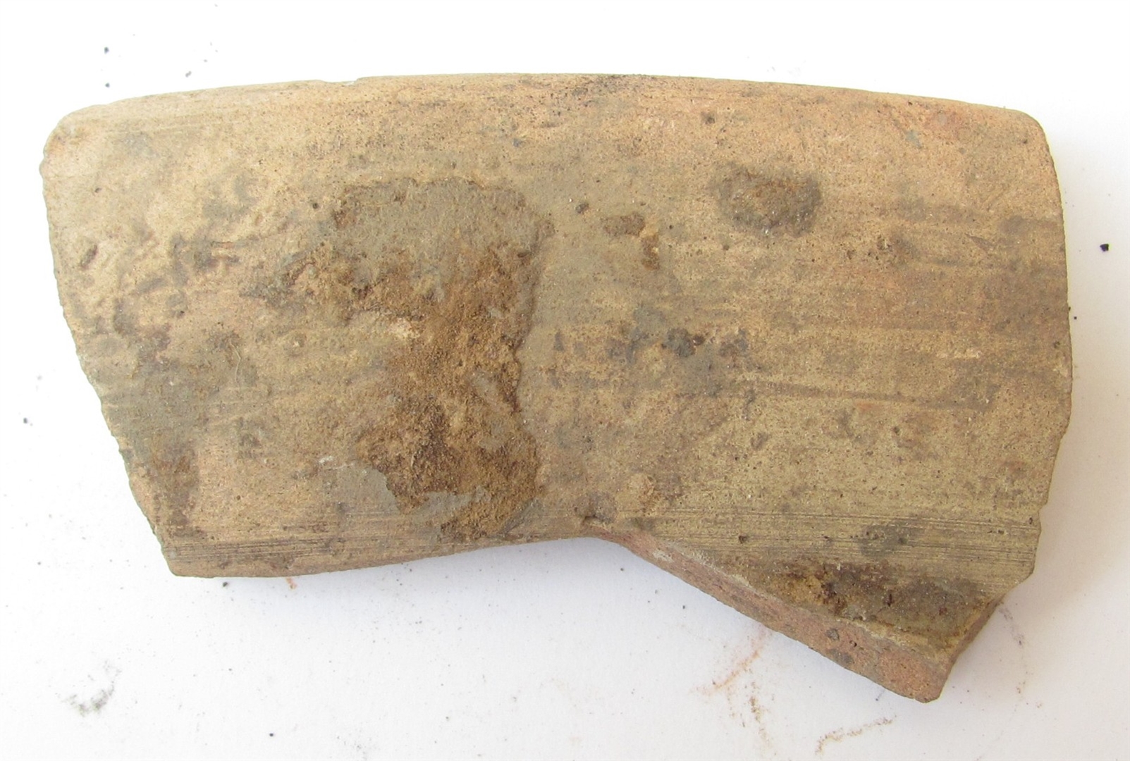 Ulomak gornjeg dijela lonca s visokim konveksnim obodom i stegnutim vratom. Glina je narančaste boje s primjesama krupnijih sivih čestica. S unutrašnje su strane vidljivi tragovi smole.