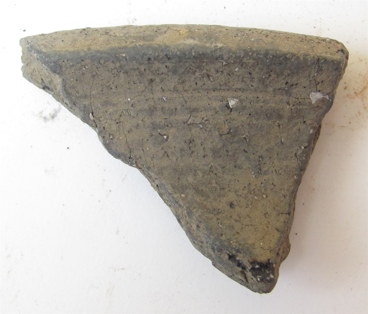 Ulomak gornjeg dijela zdjele s profiliranim izvijenim obodom. Glina je tamnosive boje s primjesama sitnijih i krupnijih bijelih kalcitnih čestica.