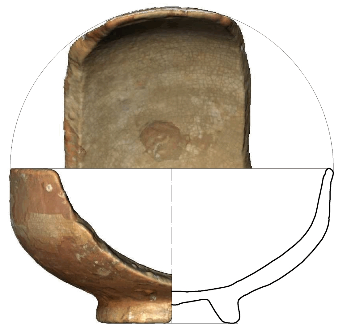Ulomak zdjelice poluloptastog oblika s nenaglašenim obodom i prstenastim dnom. Crvena, dobro pročišćena glina, engoba i prozirna glazura s unutrašnje i vanjske strane. Engobirana keramika.
