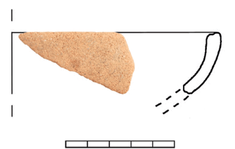 Ulomak zdjele. Svijetlo narančasta keramika, primjese sitnih crnih i bijelih kamenčića i kvarca.