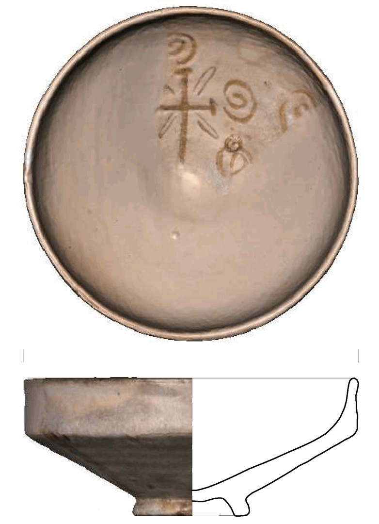 Rekonstruirana zdjela nenaglašenog oboda na prstenastoj nozi. Crvena dobro pročišćena glina. Unutra je prikazan motiv Golgote, okružen spiralicama te otisak trokrakog podloška. Glazura i engoba nalaze se iznutra i izvana. Keramika je gravirana.