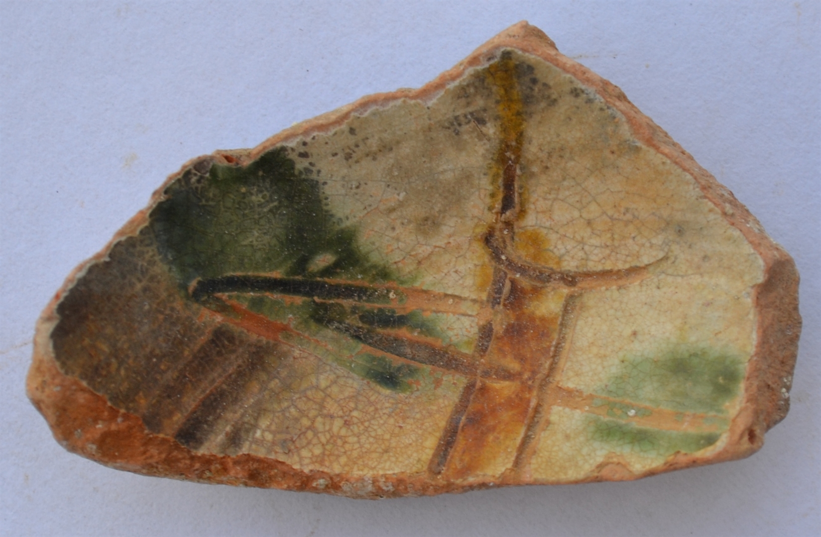 Ulomak stijenke zdjelice. Crvena, dobro pročišćena glina. Iznutra je prikazan motiv Golgote, crtež dopunjen oker i zelenom bojom. Glazura i engoba iznutra i izvana. Gravirana keramika.