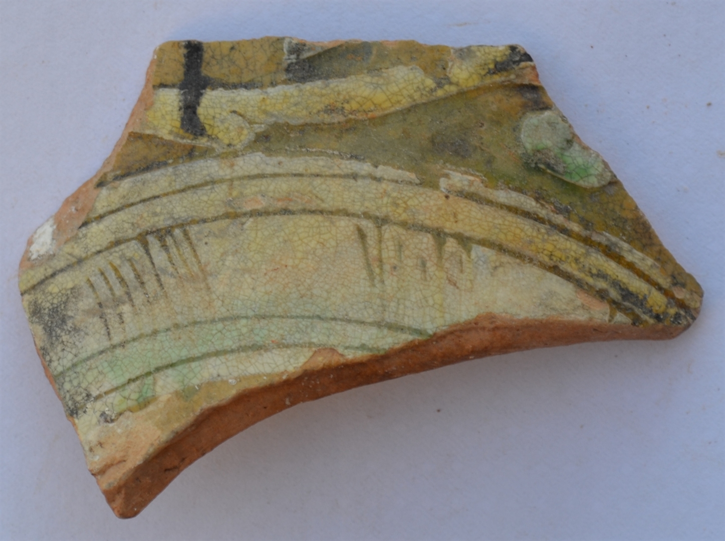 Ulomak stijenke vrča. Crvena, dobro pročišćena glina. Izvana je geometrijska dekoracija rađena graviranjem i tehnikom sniženoga dna. Doslikavanje oker, zelenom i plavom bojom. Glazura i engoba iznutra i izvana. Gravirana keramika.