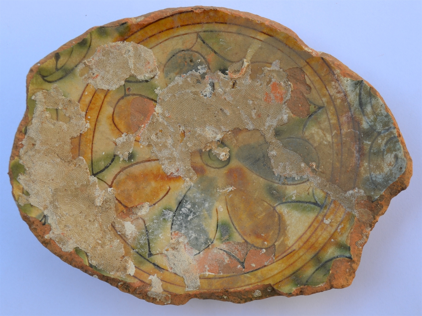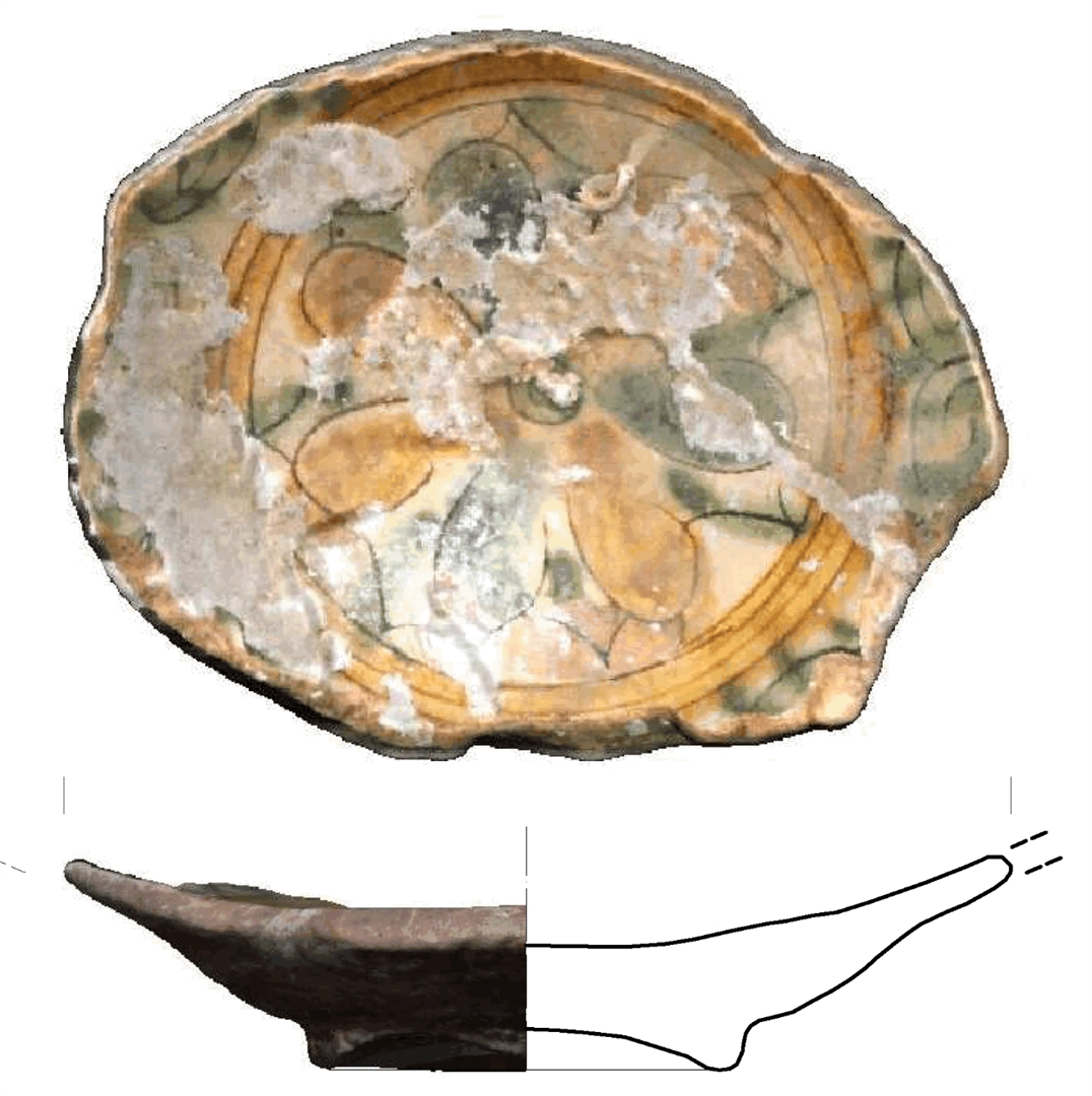 je ukrašen vegetabilnim ornamentima. Doslikavanje oker, zelenom i plavom bojom. Glazura i engoba iznutra. Gravirana keramika.