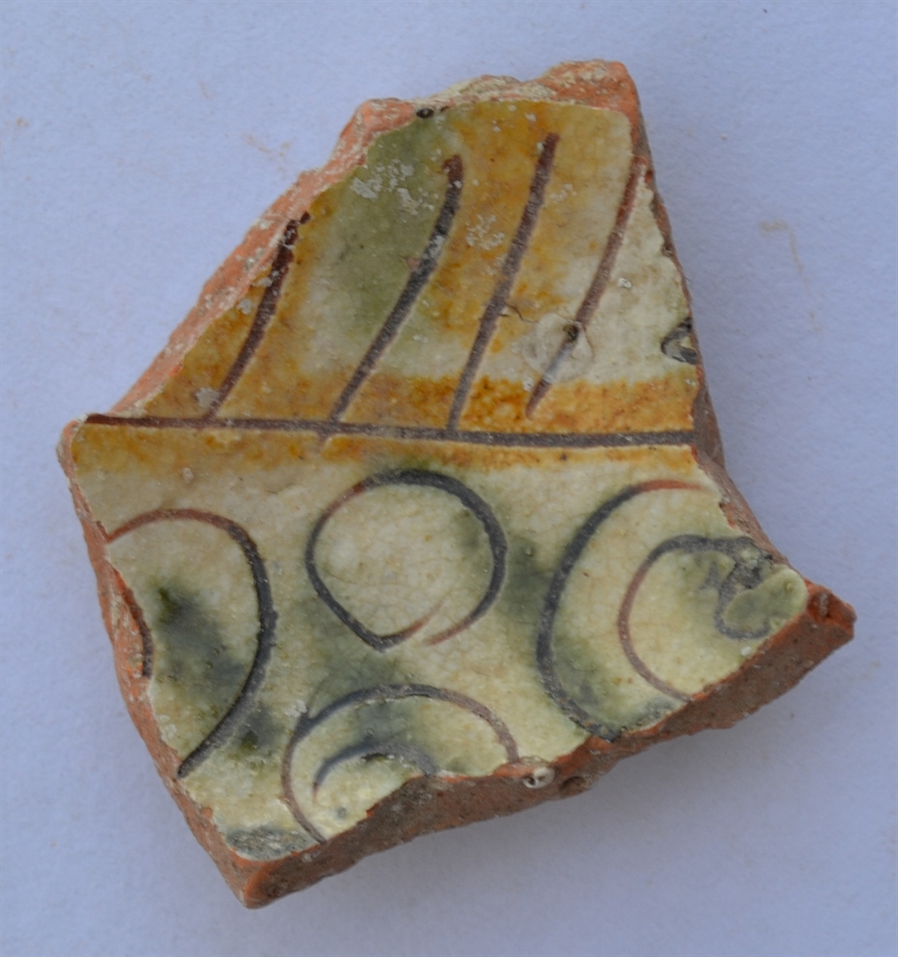 Ulomak stijenke zdjelice. Crvena, dobro pročišćena glina. Iznutra je ukrašen geometrijskim ornamentima. Doslikavanje oker i zelenom bojom. Glazura i engoba iznutra i izvana. Gravirana keramika.