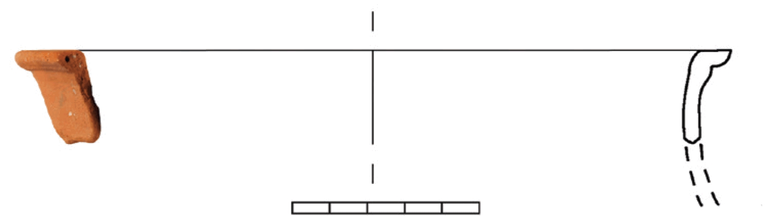 Ulomak oboda lonca. Keramika je crvenkaste boje s dosta primjesa kamenja i kvarca.