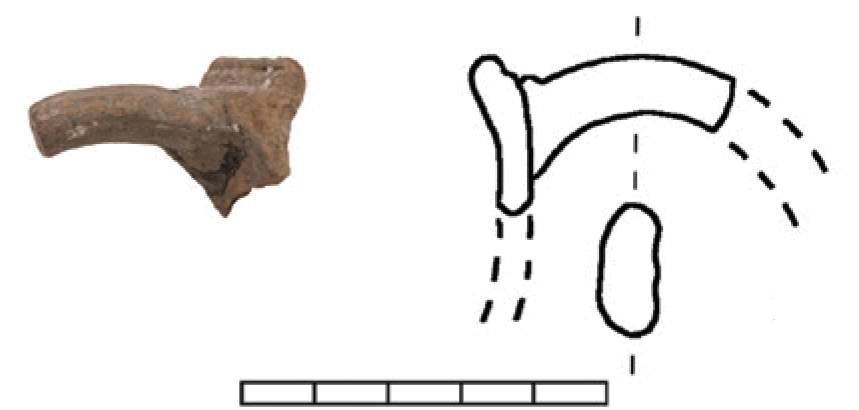 Ulomak oboda vrča s djelom ručke. Keramika je smeđecrvene boje s dosta primjesa kamenja i kvarca.