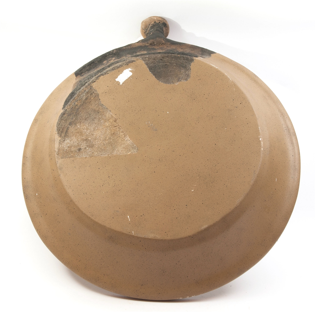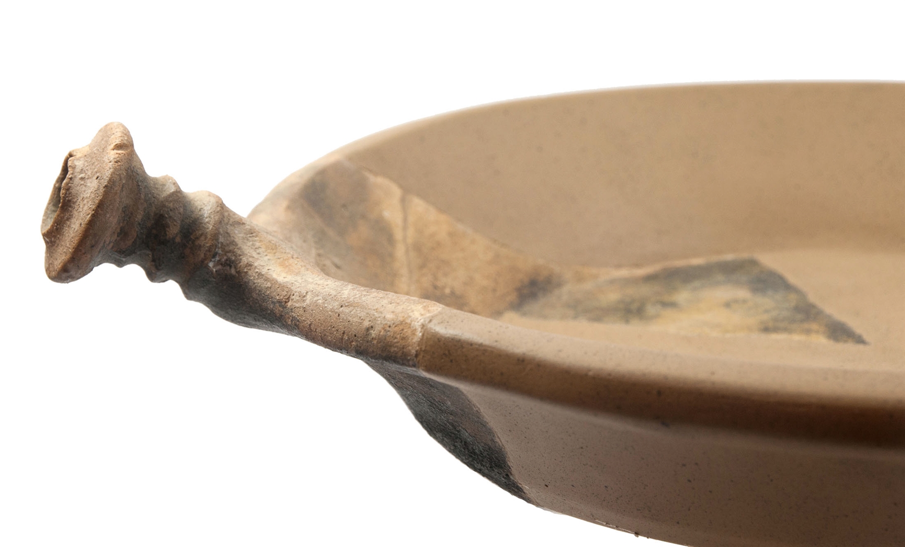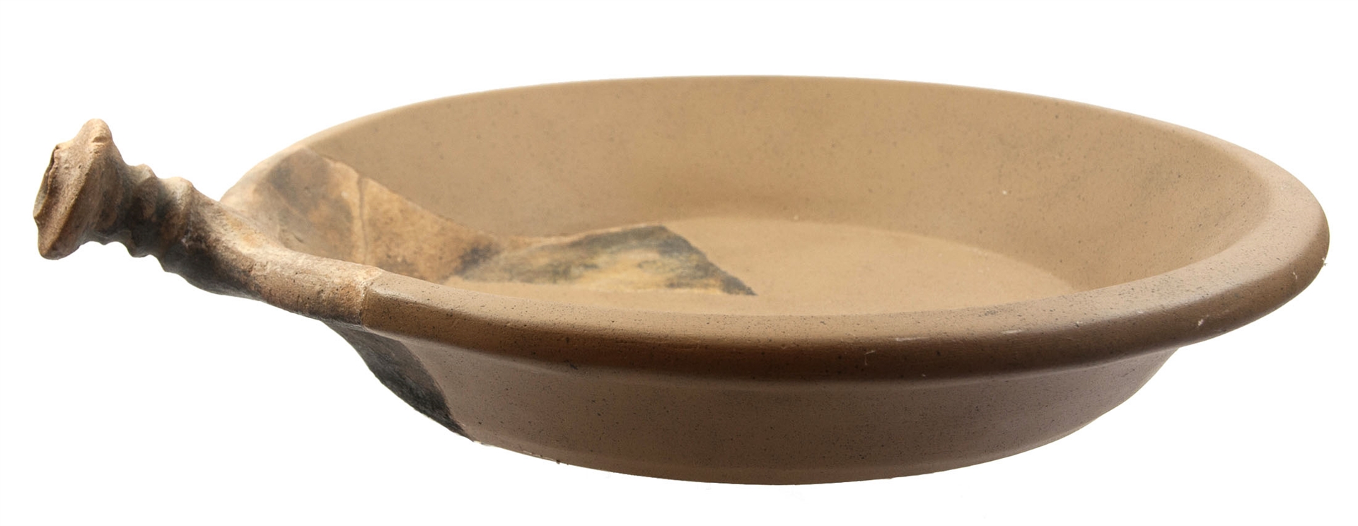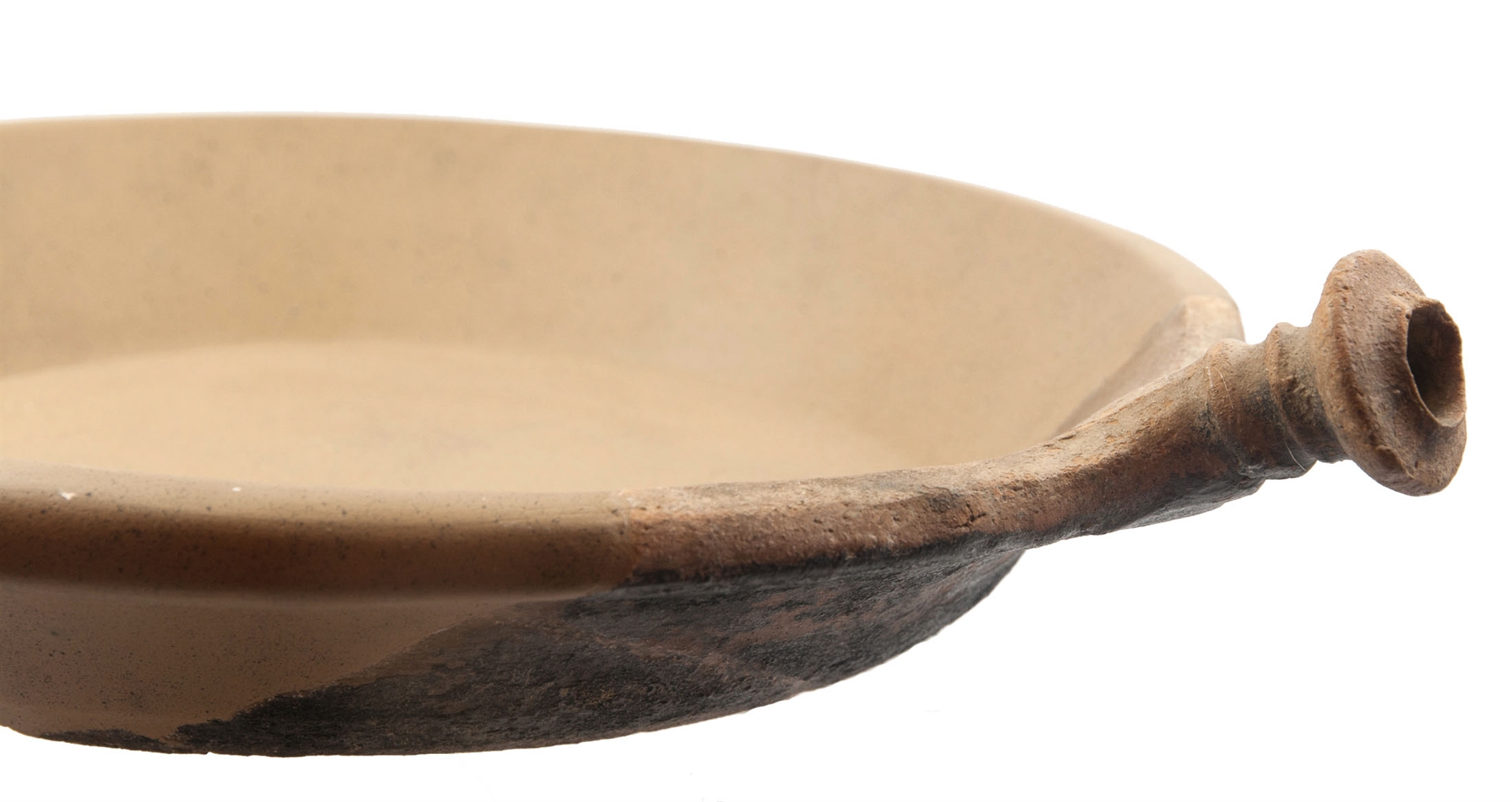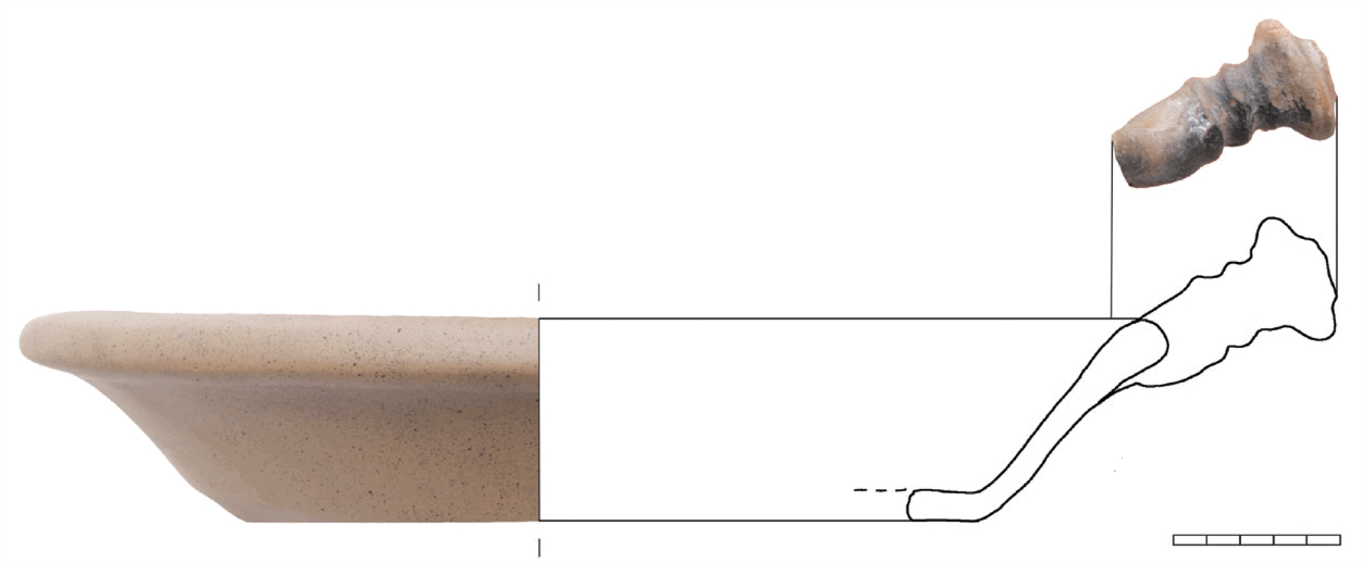 Ulomak tijela i drške tave. Keramika narančasto/sive boje, dosta primjesa kamenčića, kvarca, tragovi gareži.