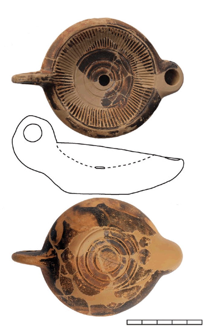 Ulomci uljanice. Keramika oker izvana smeđi premaz. Na disku niz koncentričnih krugova i radijalnih utora. Na dnu niz koncentričnih krugova i urezan X.