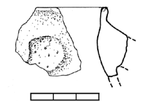 Ulomak oboda posude s tragovima ručke, s primjesama kamenčića, smeđe boje.