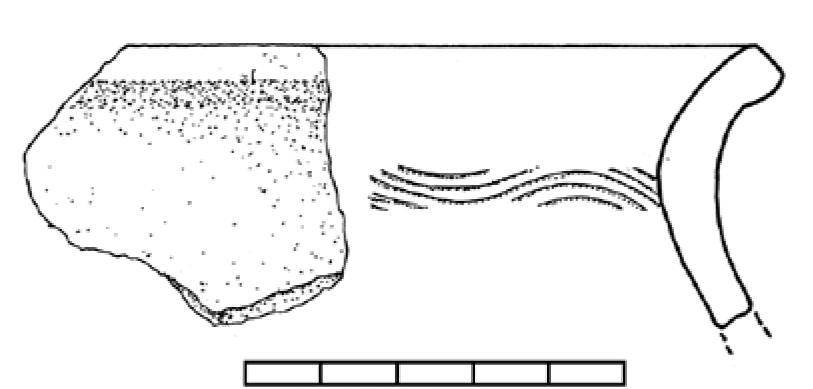 Ulomak oboda lonca s puno primjesa, izvana crvene a u prijelomu i iznutra smeđe boje.