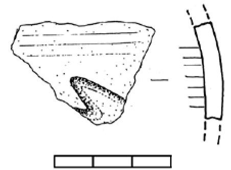 Ulomak trbuha posude s primjesama vapnenca, svijetlosive do crne boje. Ukras izveden motivom valovnice.