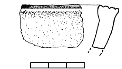 Ulomak oboda posude s puno sitnih primjesa, smeđe do narančaste boje.
