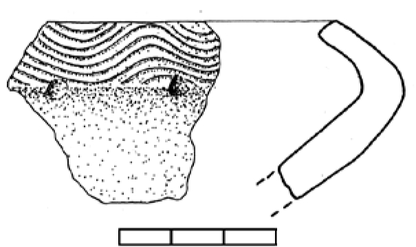 Ulomak oboda posude s puno primjesa kalcita i vapnenca, tamnosive do crne boje. Ukrašen motivom valovnice.