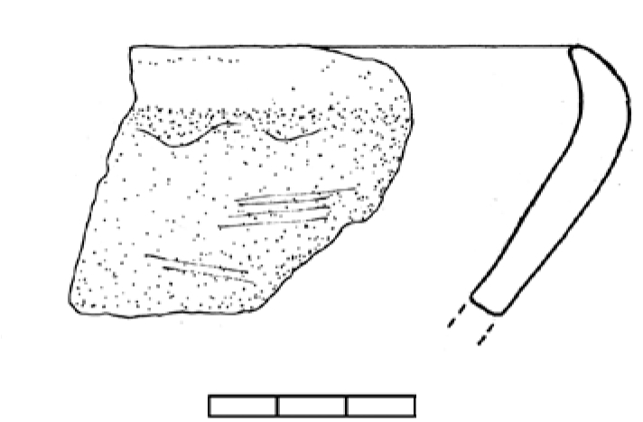 Ulomak oboda posude s mnogo primjesa, crne boje.