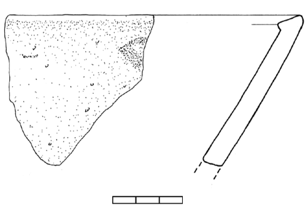 Ulomak oboda zdjele s puno raznih primjesa, crvene boje. Polumjer otvora 20 cm.