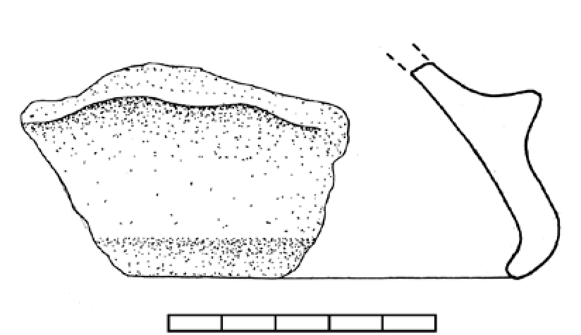 Ulomak poklopca s mnogo primjesa raznih kamenčića koji se truse, izvana crne a iznutra i u prijelomu crvene boje.