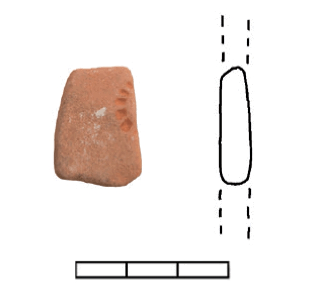 Ulomak dna posude (?) s ukrasom u obliku rozete. Keramika je narančaste boje bez primjesa.