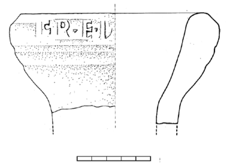 Ulomak naglašenog, kratkog ljevkasto oblikovanog oboda sa loše sačuvanim radioničkim pečatom E/FRE-