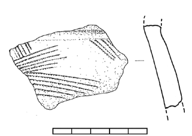 Ulomak trbuha posude s mnogo primjesa kalcita, izvana narančaste, u prijelomu crne, a iznutra tamnocrvene boje.
