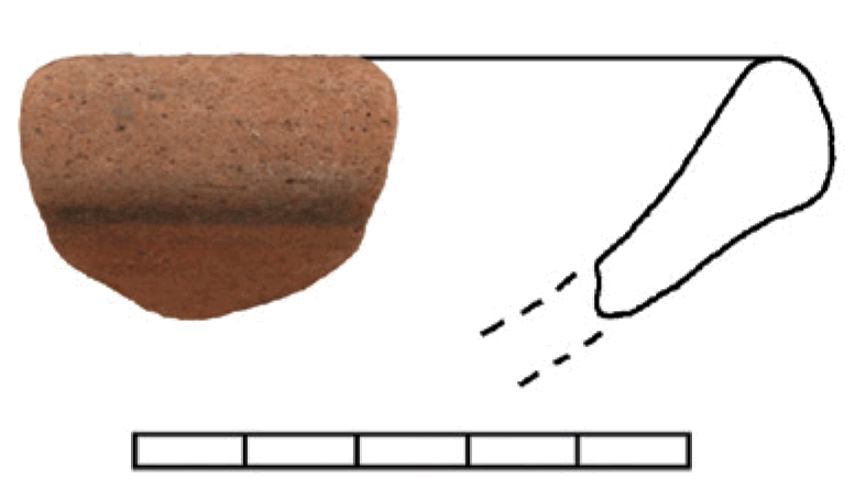 Ulomak oboda i tijela zdjele sa zadebljanjem na vanjskoj strani. Keramika je narančaste boje sa sitnim kvarcitnim česticama, finim premazom u istoj nijansi na donjem dijelu i premazom tamno smeđe boje na gornjem dijelu oboda.