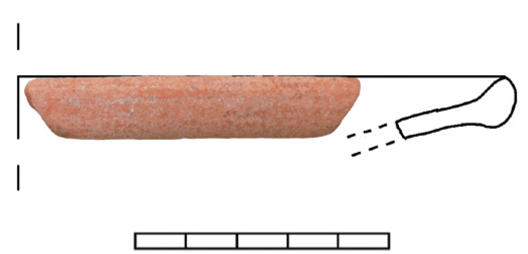 Ulomak oboda i tijela tanjura sa zadebljanjem na vanjskoj strani. Keramika je narančaste boje bez primjesa s finim premazom u istoj nijansi.